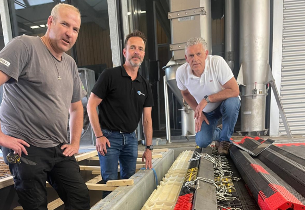 Foto boven: De aandrijving bevindt zich aan de buitenzijden. Ook goed te zien zijn de haaientand -tandwielen die de band met efficiënte kracht overbrengen links op foto Joep Daanen van Peda, midden Jean-Pierre Claassen van Ammeraal Beltech en rechts Lex Peters van ANAC. (foto ANAC Nijmegen)
